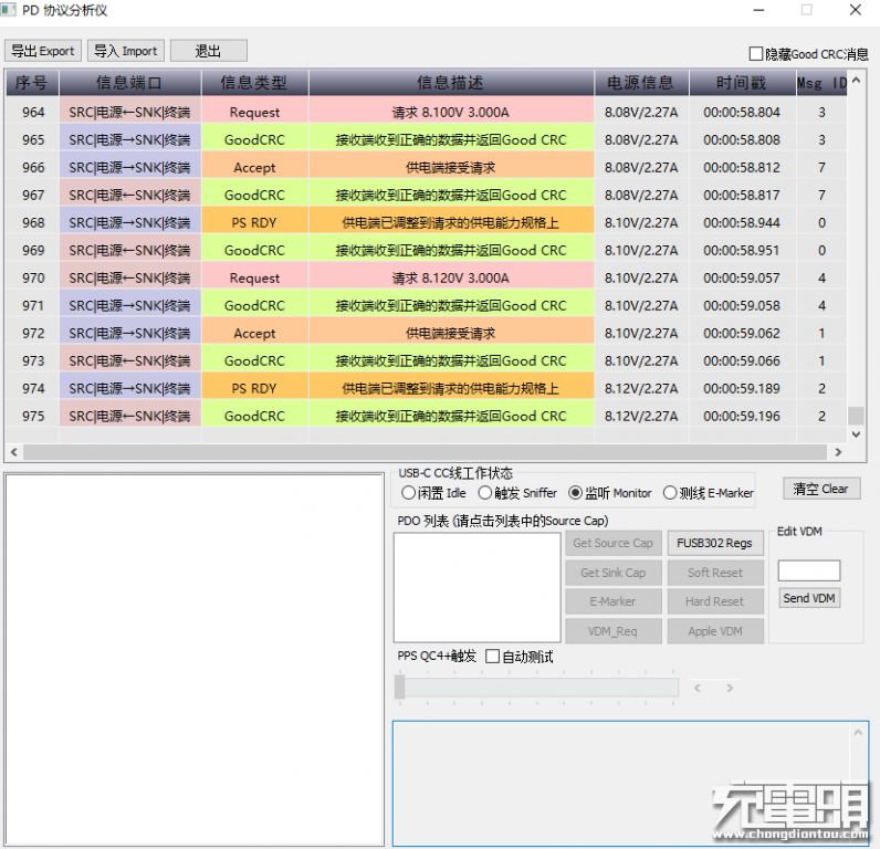 在使用倍思1A1C充电器对魅族16Xs充电的同时使用上位机进行充电协议通信监听,发现充电电压正在以0.02V切换,符合PPS快充特性。魅族16Xs在使用支持PD3.0、PPS、QC、PE协议的充电器时会先握手PPS充电协议。