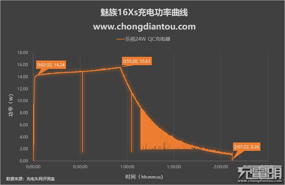 然后是乐视24W QC充电器充魅族16Xs手机的功率变化情况。充电没多久功率上升到14.24W并且逐渐上升,在充电55分钟时达到本次最高充电功率15.61W,随后功率开始下降,全程充电时间为2小时7分钟。