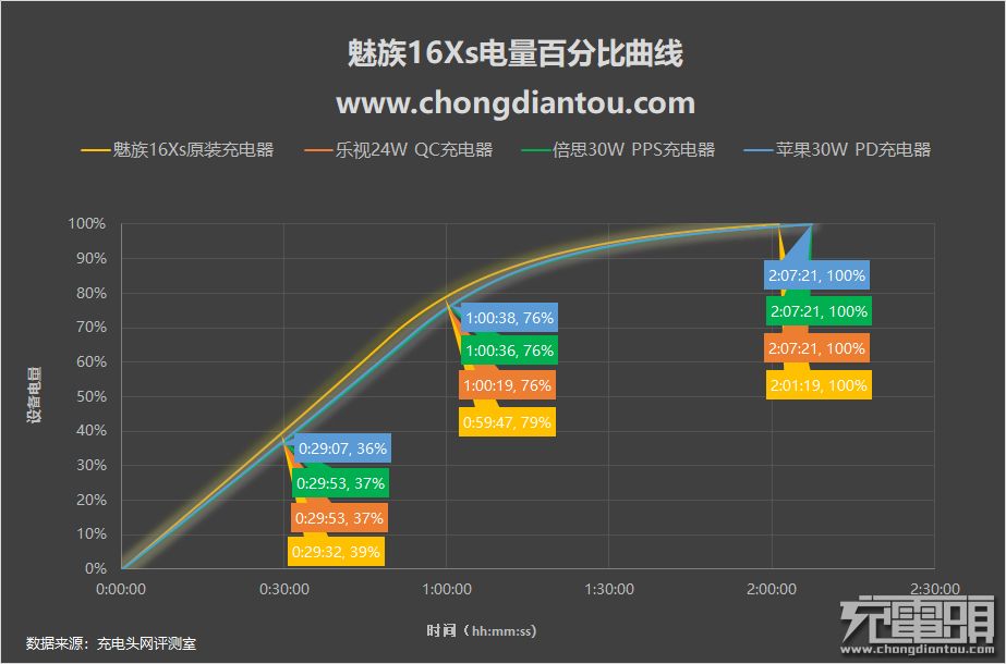 小编分别使用魅族16Xs原装充电器、乐视24W QC充电器、倍思1A1C 30W PPS充电器、苹果30W PD充电器对魅族16Xs手机进行电量0%~100%全程充电测试,电脑上位机进行数据纪录,整理制成如下表格。