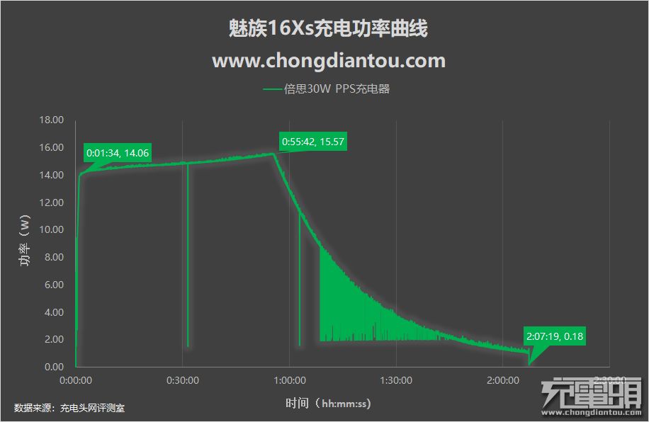 再来看下倍思30W PPS充电器。这款充电器在给魅族16Xs充电时的功率变化曲线几乎和乐视24W QC充电器充魅族16Xs时的表现一样,全程最高功率15.57W,全程充电时间为2小时7分钟。