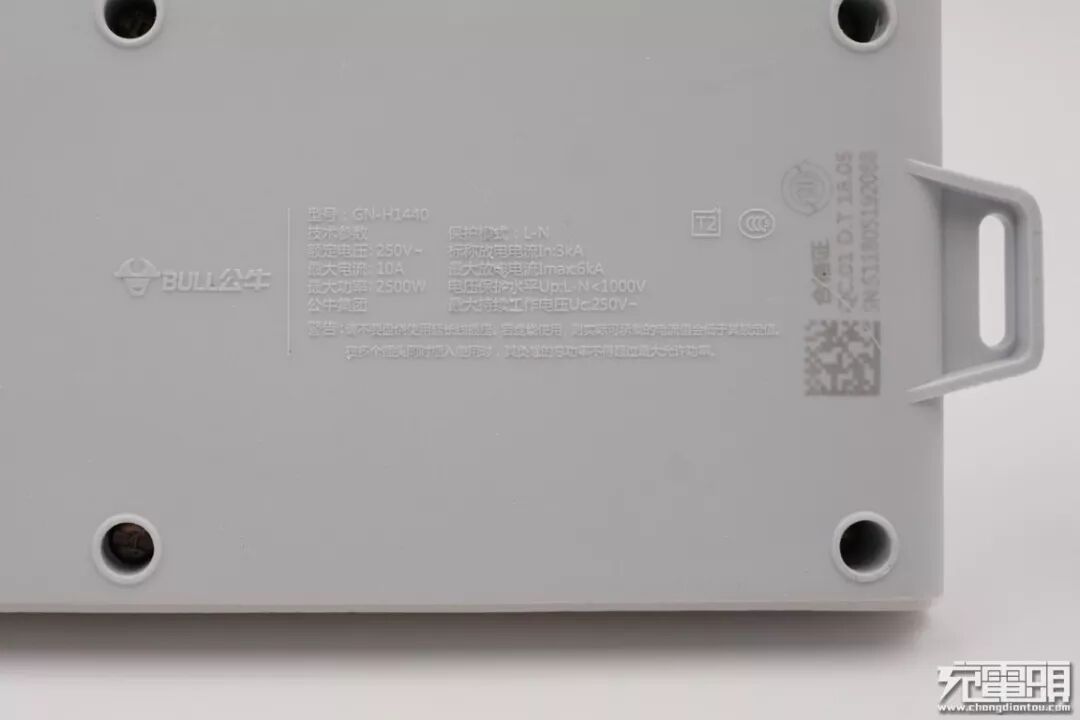 插座的底面凸印产品技术参数、合格序列码、3C认证标志。最右两侧还有一个挂钩,挂在墙上使用时固定更牢靠。