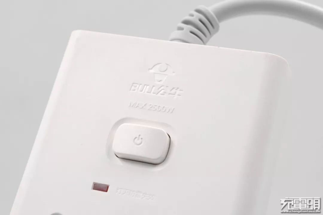 插座的设计非常贴心,一键切断供电按钮设置的非常突出,一款插座的好坏也能从开关中反馈出来,公牛这种专利设计的开关使用寿命经久耐用。方便及时开、断电。防雷失效提示灯也能让你及时掌握插座使用状态,防止意外发生。电源键上方刻印有公牛Logo与最大2500W功率标识。