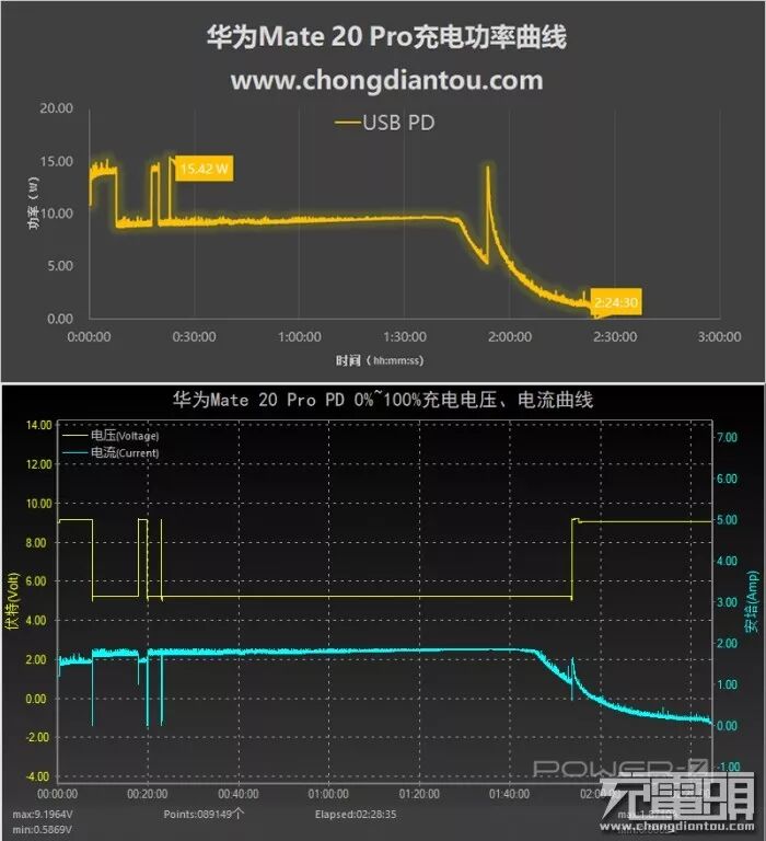 使用网易智造(NIT-TAC-01-65W-WH)65W PD充电器充华为Mate 20 Pro,PD快充开启,手机握手9V档位充电,可能是随着温度的升高,也有可能是其他原因,在接近10分钟时,电压掉落至5V,此后大部分时间都是以5V充电,功率维持在9W左右。本次充电的最高功率出现在20分钟左右,达14.42W,全程充满耗时2小时24分钟。