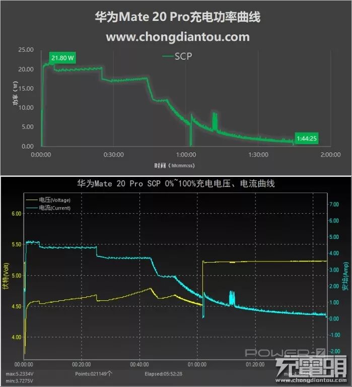 使用华为(HW-090200CH1)充电器的USB-A(紫色)口充华为Mate 20 Pro,SCP快充开启,开头1分钟,握手SCP成功,电压冲3.7V缓慢上升到4.4V,并没有像FCP、PD快充那样直接蹭的一下上去,大约充了5分钟,功率达到最高,21.8W。随着电量的增高,功率开始阶段式下降,全程耗时1小时44分钟。
