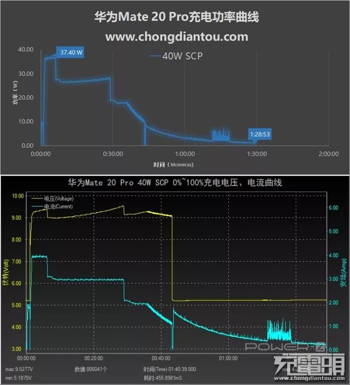 使用华为40W SCP充电器(HW-100400C00)充华为Mate 20 Pro。手机刚开始充电的时候并没有马上开启40W SCP快充,而是普通5V/2A,充了1分钟左右,手机开机后进入40W SCP快充,电压电流直线上升,在5分钟左右,功率达到了最大,37.4W。随着电量的增多,功率呈阶段式下降,全程耗时1小时28分钟。