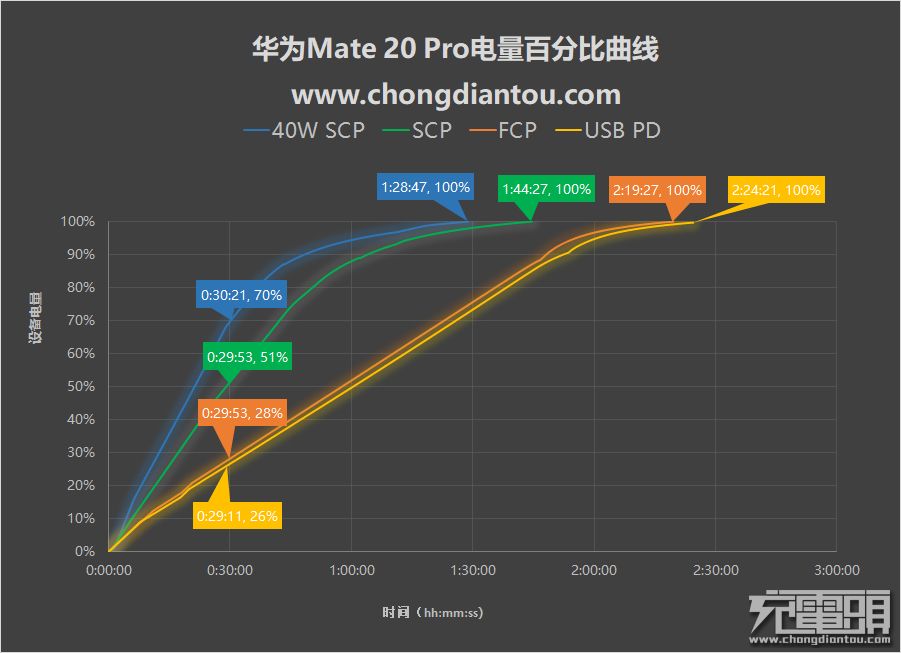 华为Mate 20 Pro支持40W SCP、SCP、FCP、USB PD这四种快充协议,每一种快充的功率并不相同,充电速度最快的是40W SCP快充,最高功率37.4W,半小时充70%电量,全程1小时28分钟,花抽根烟的时间充下电,可以打很多把王者荣耀了吧;其次是SCP快充,最高功率21.8W,半小时充51%,全程1小时44分钟;FCP与USB PD快充的充电速度相差不大,FCP最高功率13.58W,半小时充至28%,全程2小时19分钟,USB PD最高功率15.42W,半小时充至26%,全程2小时24分钟。