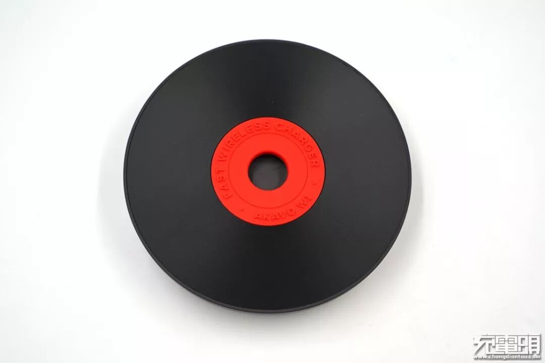 下面我们来看下爱否W1无线充电器本体。它与爱否开物的另一款立式无线充电器S1不同,它是一款“卧式”形态的无线充电器。顶面由灰、红、黑三大“色块”圆环组成,散发出十足的“黑胶唱片”气息。外壳壳体是塑料材质。