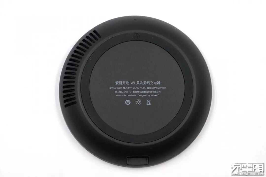 爱否W1无线充电器底部贴有一圈软胶,起防滑作用;在上半环中间位置,软胶下隐藏着一枚风扇开关按键;按键再往上是一枚隐藏式无线充电器工作指示灯;左上角旁侧有19个条形开孔,为无线充电器的散热孔;下方则是无线充电器输入接口;软胶环环内印有产品相关参数,与包装盒背面印刷的一致。