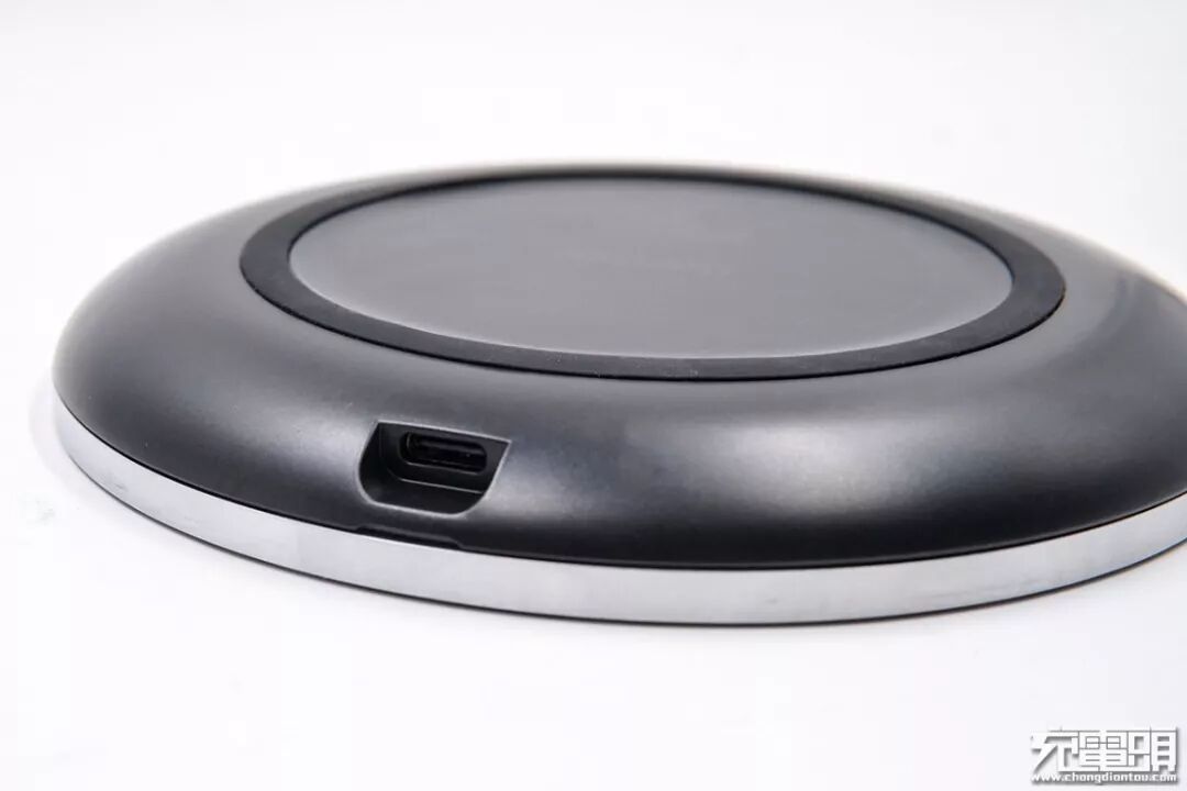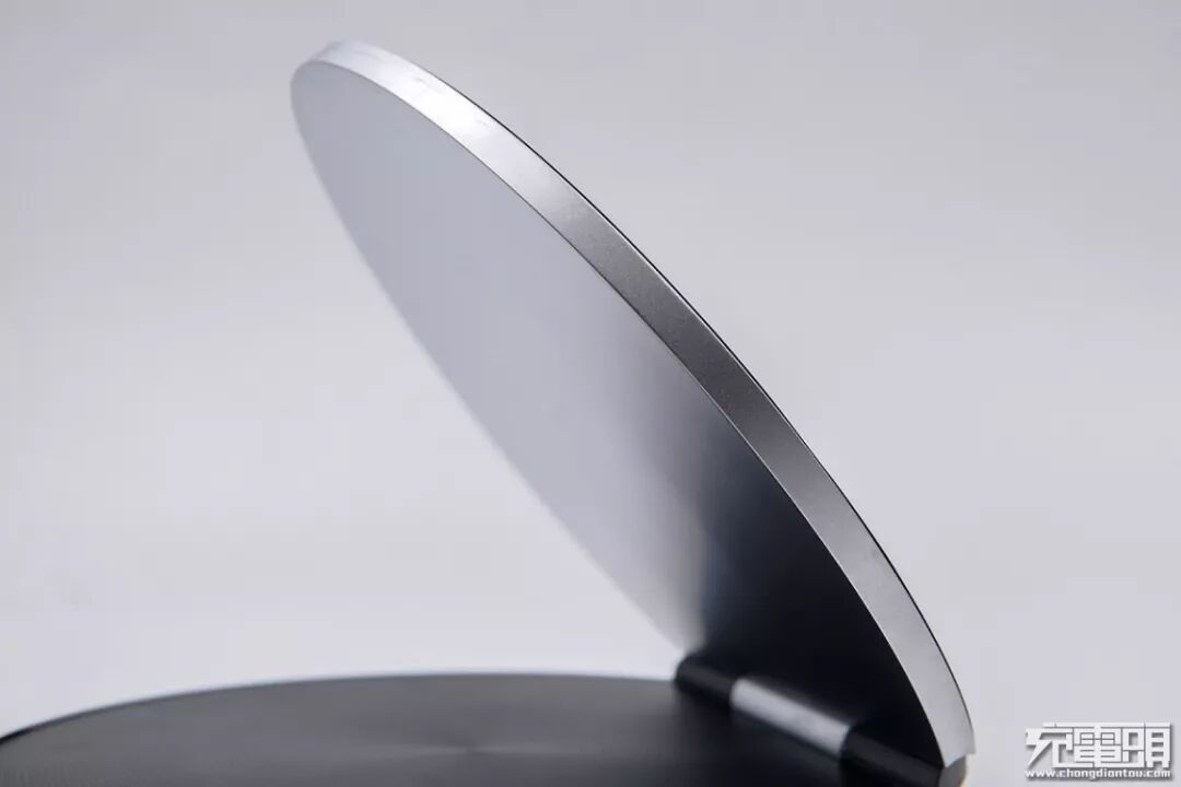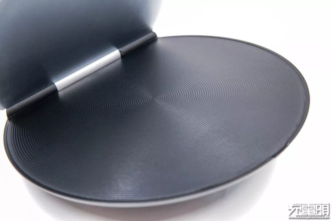 无线输出这部分完全使用一体铝CNC而成,更利于热量传递帮助散热,表面磨砂雾面处理非常细腻,手感顺滑。无线充的重量也都集中在这部分,好在底座足够大,放置还是非常稳定的。