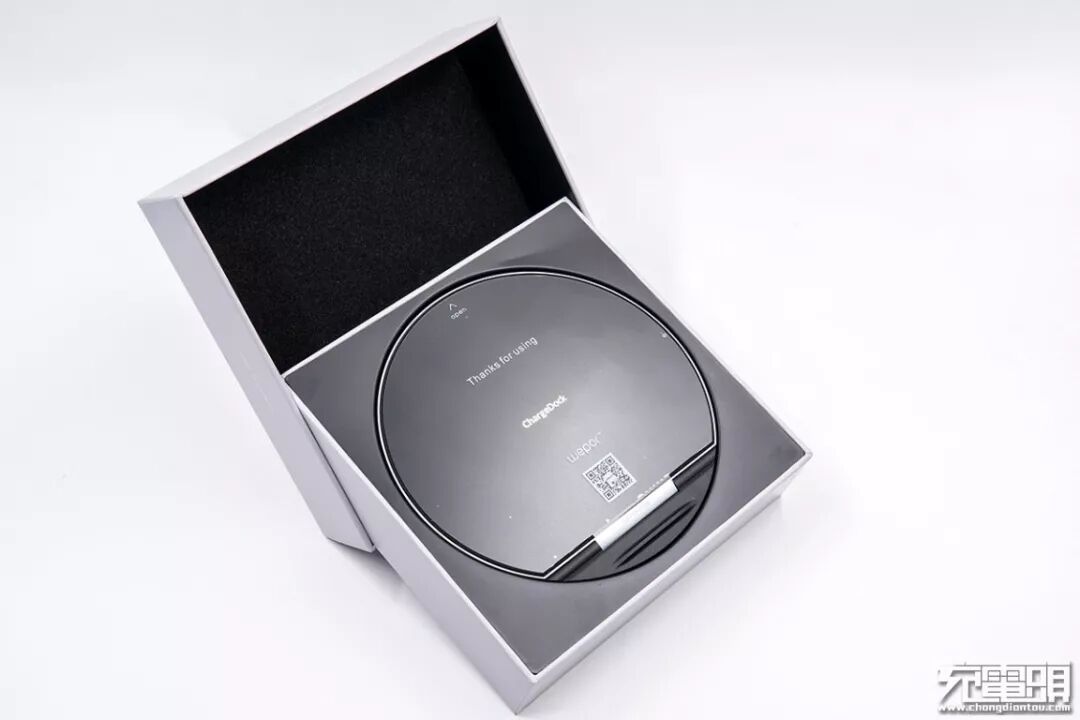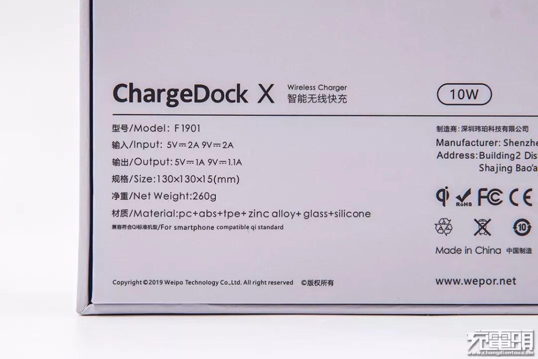 从外包装上的参数了解到,WEPOR ChargeDock X折叠无线充支架型号为F1901,支持5V/2A,9V/2A最大18W的输入功率。输出参数则为5V/1A、9V/1.1,最大10W。官方宣称这款无线充是支持Apple 7.5W无线充的。无线充直径130mm,厚度15mm,重量约为260克。