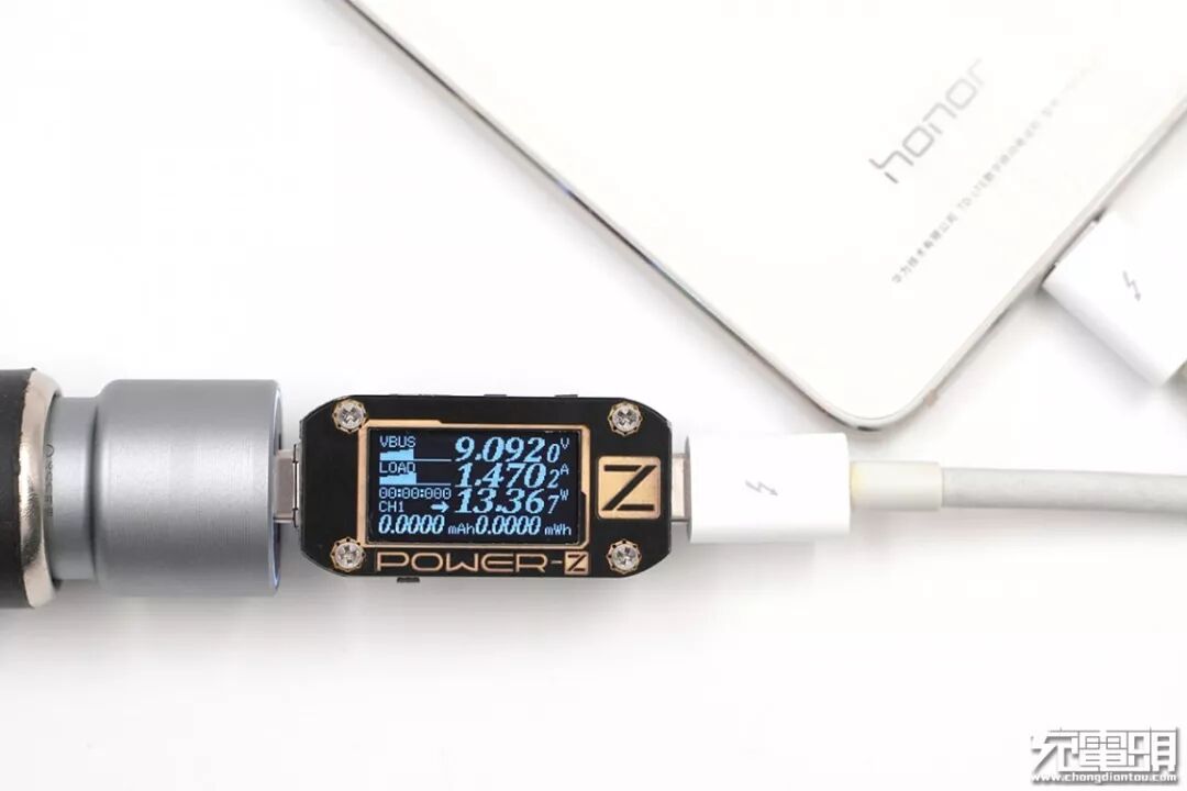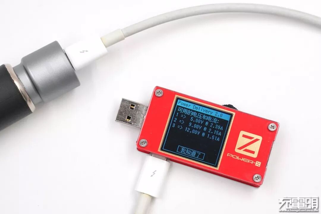 在来到档位分析界面,从测试仪的显示屏中可以看到该款车充USB-C口还支持PD 2.0快充,具备5V/2.39A、9V/2.15A、12V/1.51A三个档位输出。