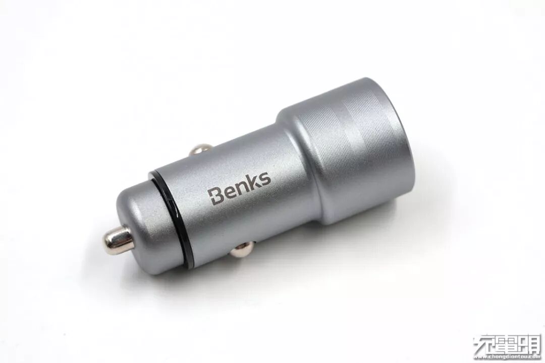 邦克仕车充外壳采用了金属+PC材质组合,腰身为金属,表面阳极氧化处理有轻微磨砂质感,并且在靠顶端有螺纹装饰。腰身上印有邦克仕品牌标识:Benks。