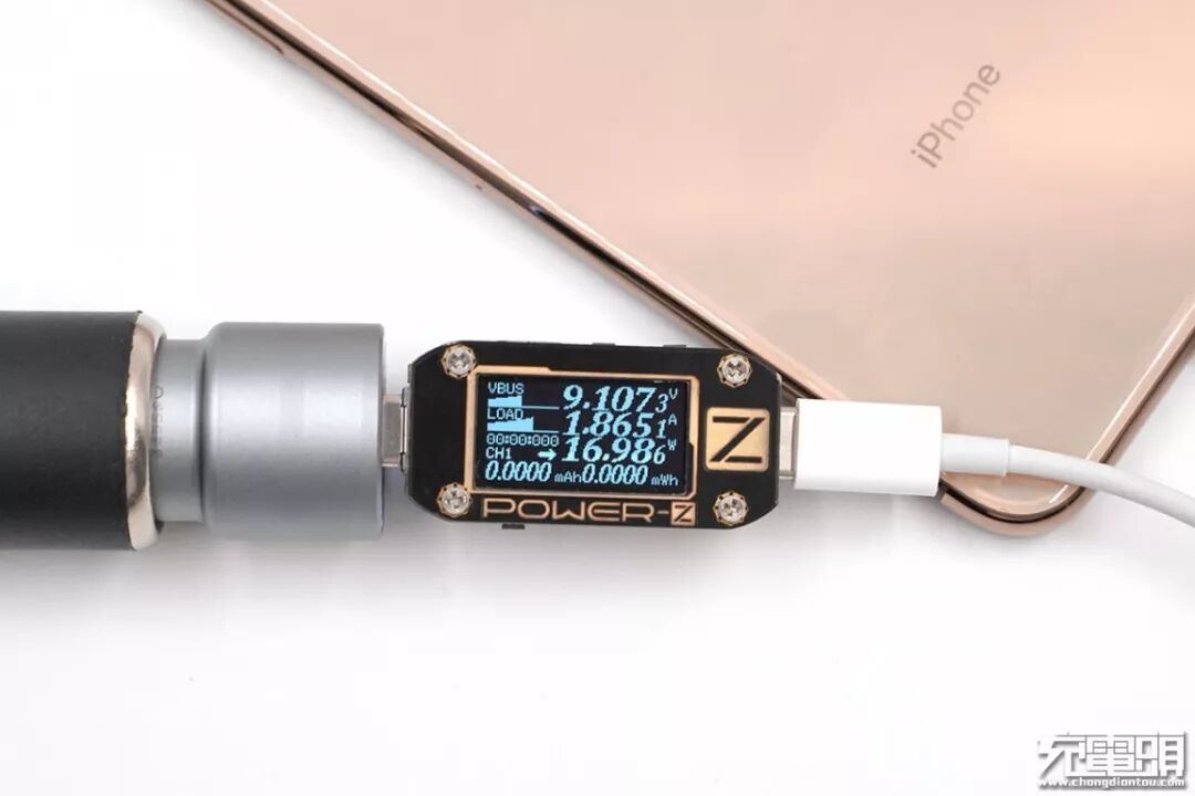 使用邦克仕车充的USB-C口充iPhone XS Max,电压9.1V,电流1.86A,功率16.98W,开启PD快充。