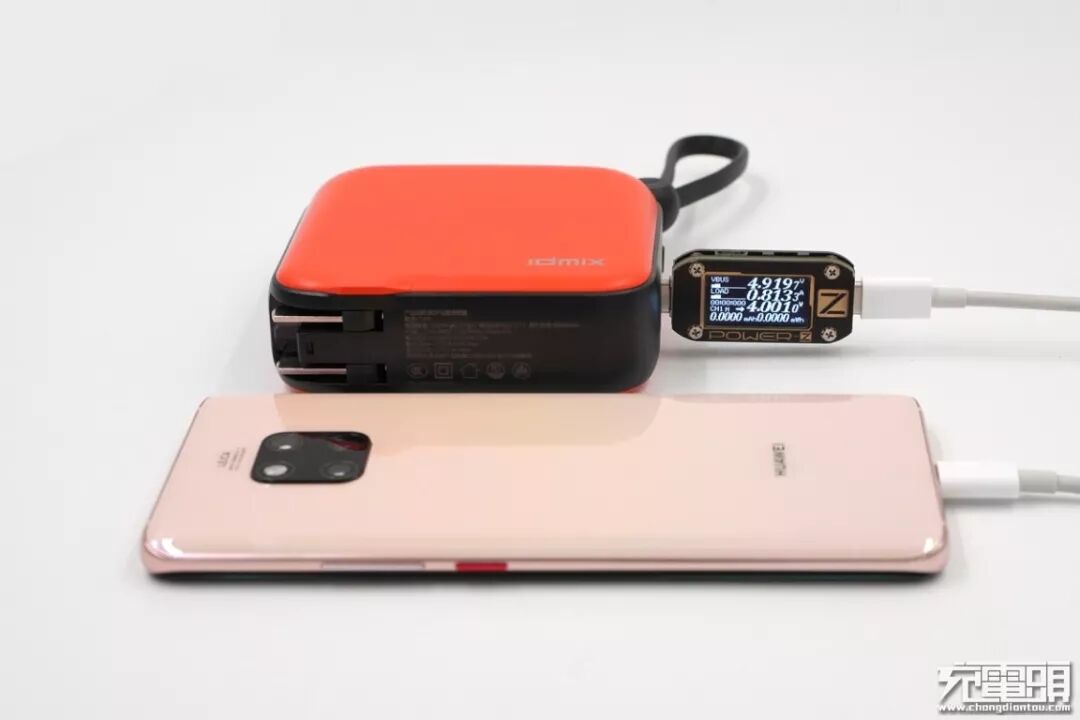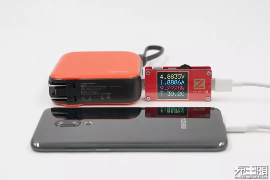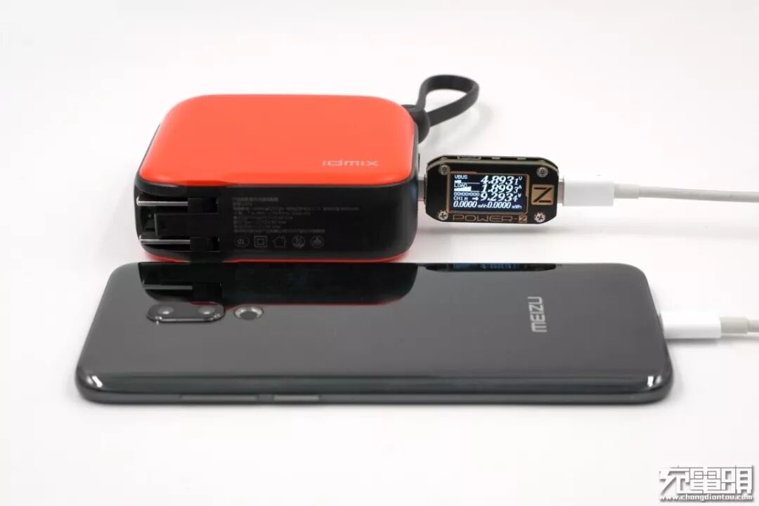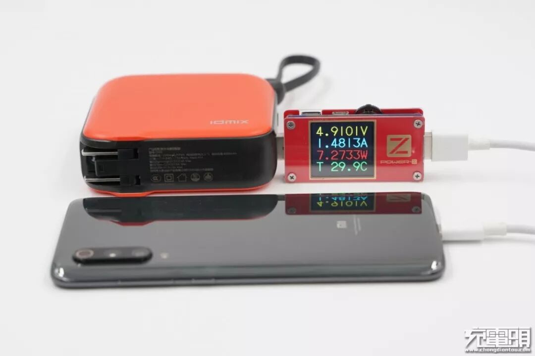 单独使用IDMIX MR CHARGER 10000多合一移动电源的USB-A接口对小米9进行充电,当前电压为4.91V,当前电流1.48A,功率为7.27W。