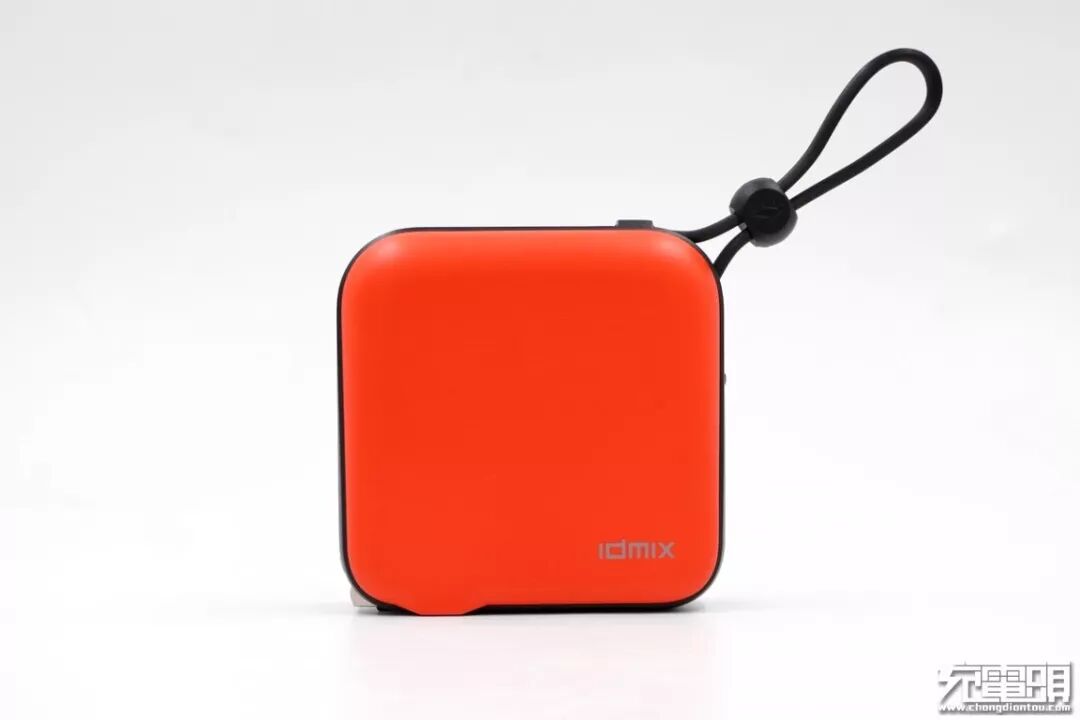 我们拿到手的这只IDMIX MR CHARGER 10000多合一移动电源为橙色版本,黑橙搭配颜色时尚,左下角有银灰色的“IDMIX”文字LOGO。移动电源采用塑料外壳,造型圆润,整机没有棱角。右上角的挂绳其实也是自带数据线的一部分。
