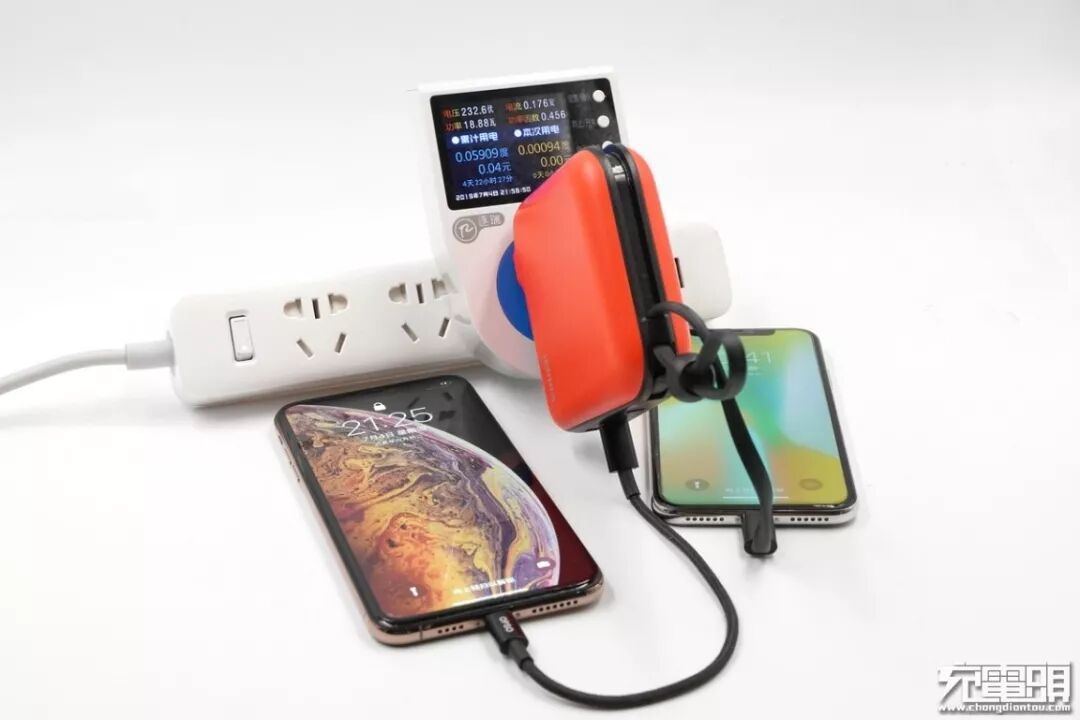 使用自身插头充电的同时,自带线及USB-C接口同时向外输出,此时的充电总功率为18.88W。