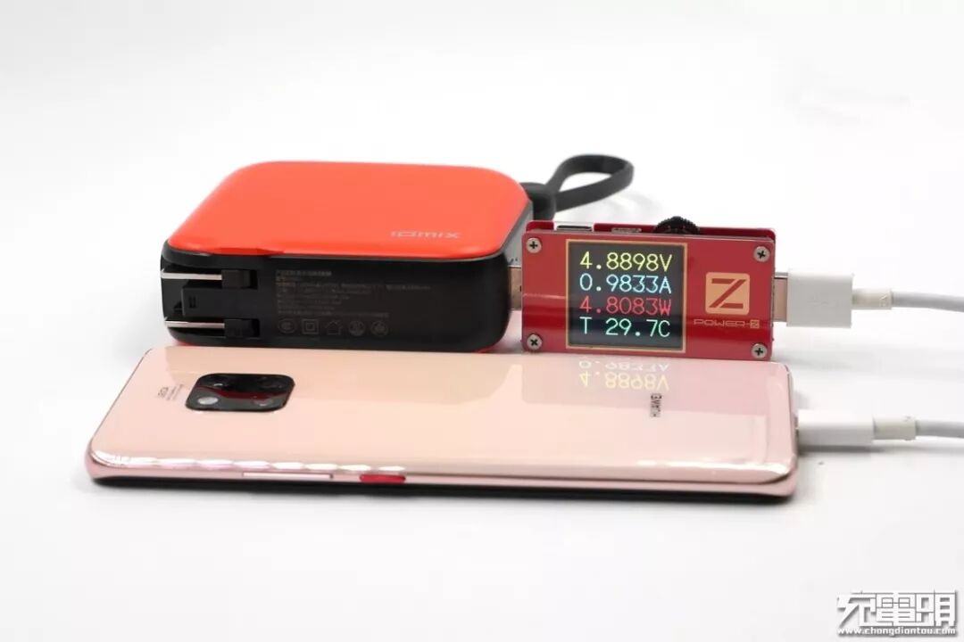 使用移动电源的USB-A接口对华为Mate20 Pro进行充电,当前电压为4.88V,当前电流0.98A,功率为4.80W。