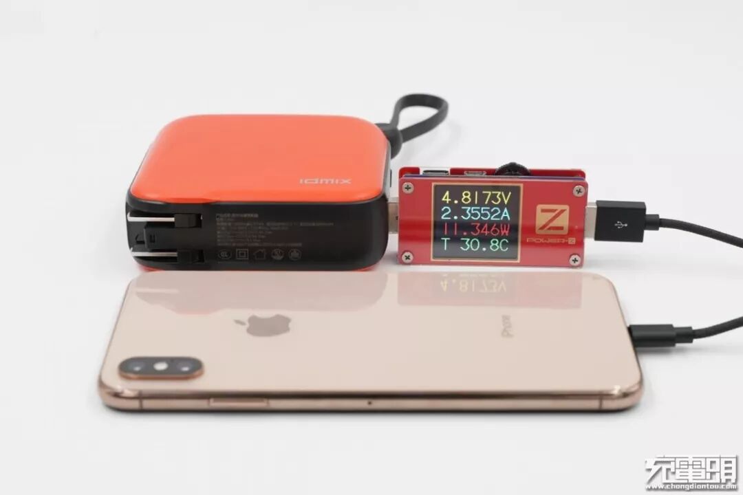 使用移动电源的USB-A接口对iPhone XS Max进行充电,当前电压为4.81V,当前电流2.35A,功率为11.34W,开启Apple 2.4A充电模式。
