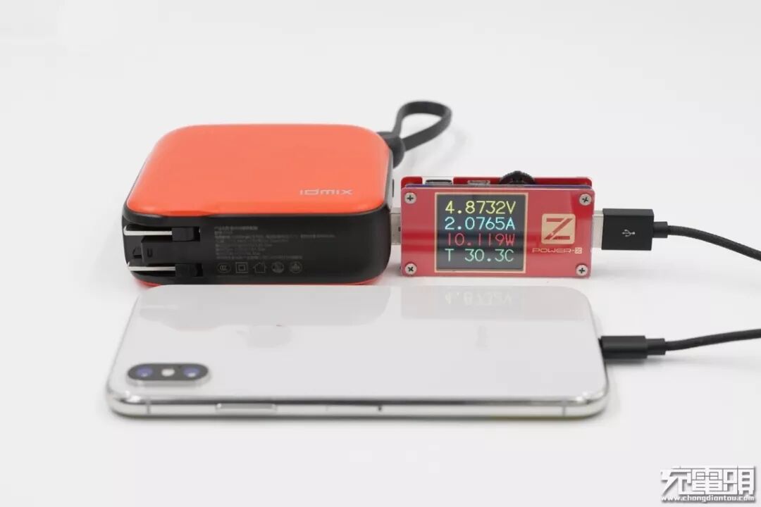 使用移动电源的USB-A接口对iPhone X进行充电,当前电压为4.87V,当前电流2.07A,功率为10.11W,开启Apple 2.4A充电模式。
