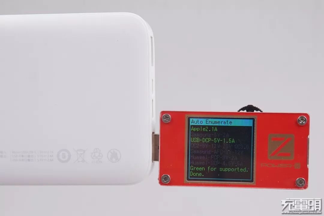 在对两个输出接口进行协议测试发现,标有OUT1的USB-A接口支持Apple 2.1A。