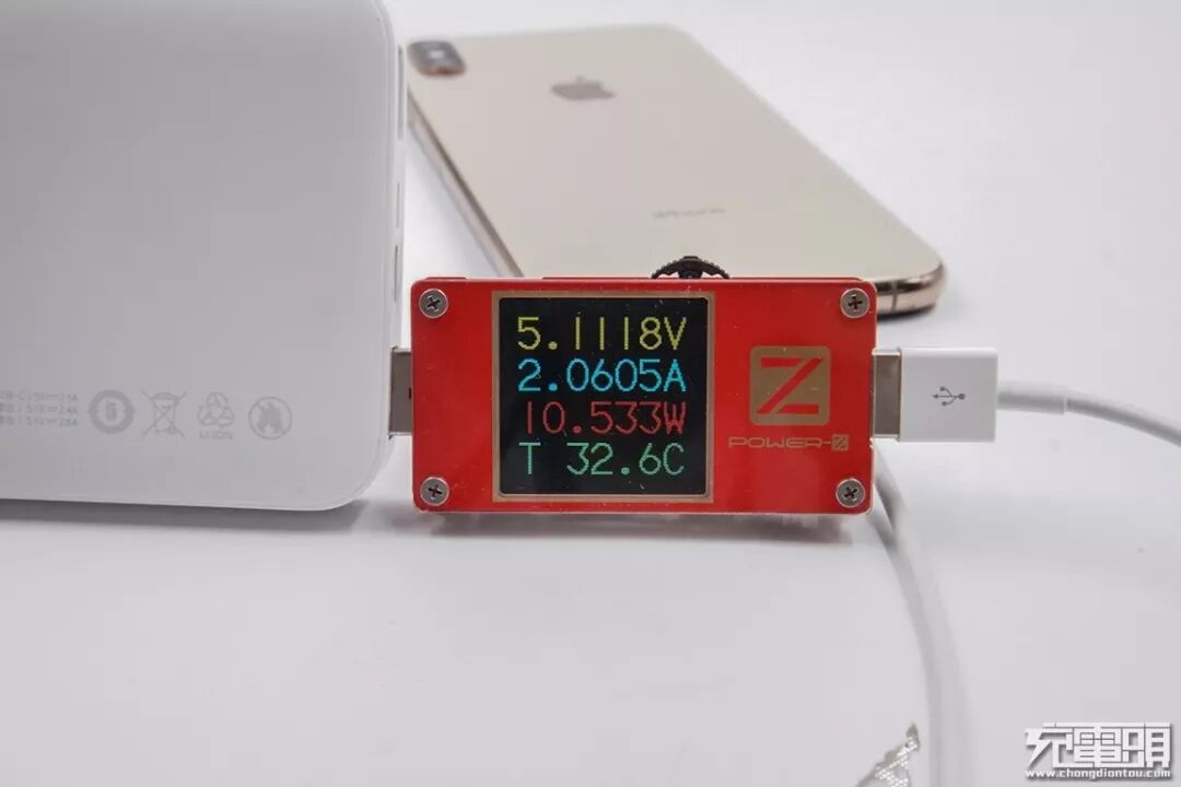 使用Redmi 充电宝标准版的OUT1接口充iPhone XS Max,电压5.11V,电流2.06A,功率10.53W,开启Apple2.1A协议充电。