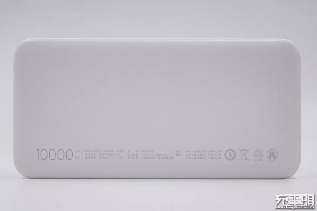 揭开即可看到接口。Redmi 充电宝标准版配备了两个USB-A输出接口,一个Micro-USB输入接口,一个USB-C输入接口,每个接口处都凸印了输出参数,可以看到两个USB-A接口输出功率均为5.1V/2.4A。USB-C接口不支持输出有一些遗憾。