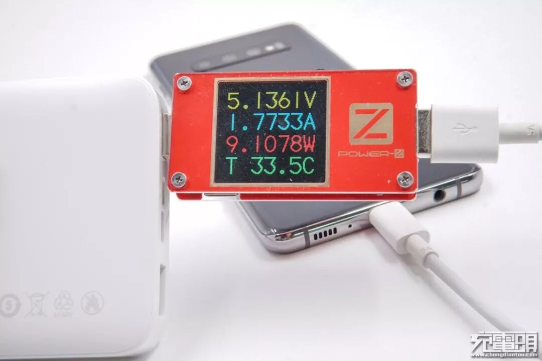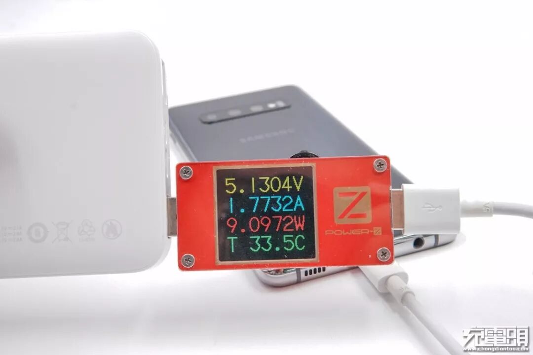 充三星S10+,电压5.13V,电流1.77A,功率9.10W。