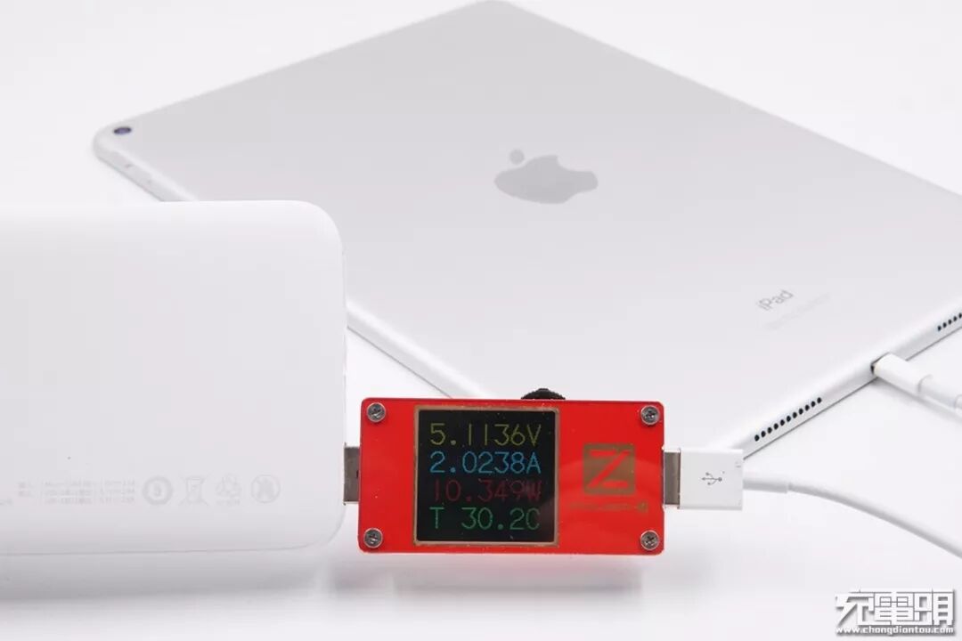 充iPad Air 3,电压5.11V,电流2.02A,功率10.34W,开启Apple2.1A协议充电。