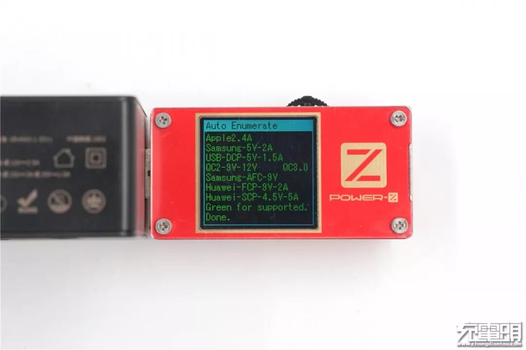 使用ChargerLAB Power-Z KT001对充电器USB-A口进行协议检测,测得支持Apple 2.4A、DCP、三星5V/2A协议,以及QC 2.0、QC 3.0、AFC、FCP、SCP快充协议。