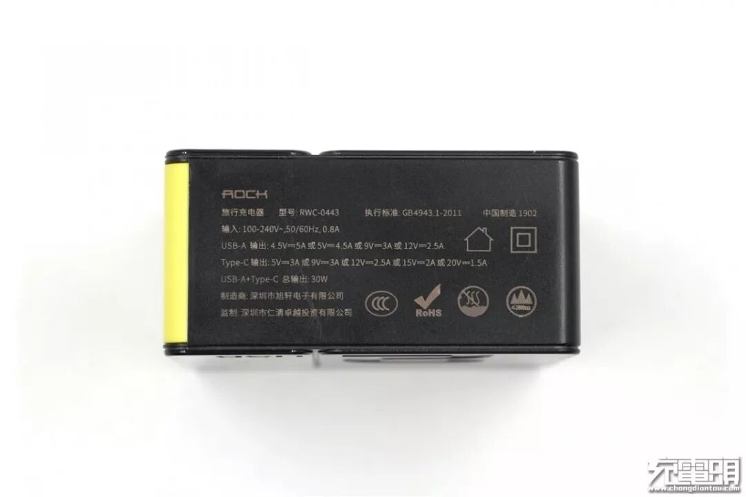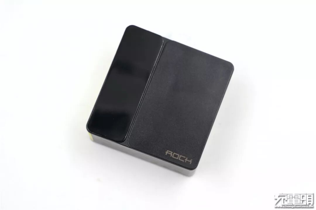 ROCK这款充电器外形方方正正,颜色为黑色。从上图可以看出,充电器正面共有亮面与哑光两种材质组成,右下角标有灰色“ROCK”Logo。