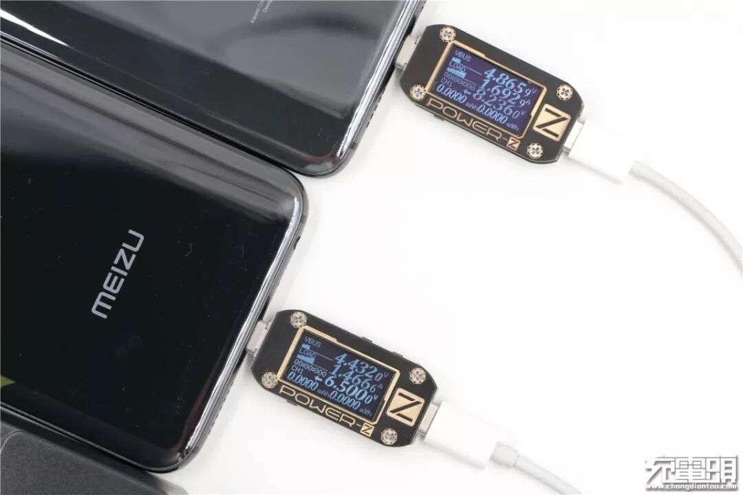充魅族16th Plus,电压8.11V,电流2.53A,功率20.6W,开启PE快充,ROCK 1A1C 30W PD充电器USB-C口还支持PE快充。