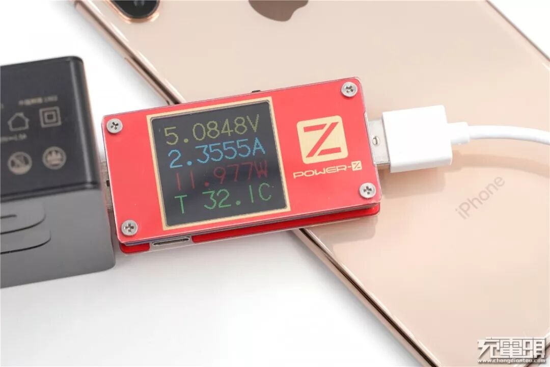 使用ROCK 1A1C 30W PD充电器USB-A口充iPhone XS Max,电压5.08V,电流2.35A,功率11.97W,开启Apple 2.4A充电协议。