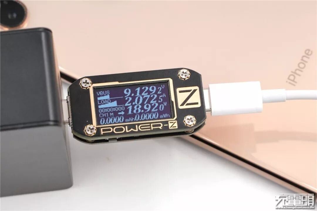 充iPhone XS,电压9.13V,电流1.64A,功率15.01W,开启PD快充。