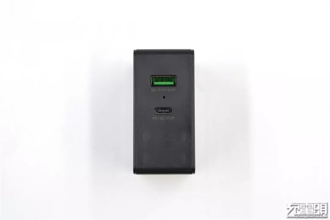 ROCK 1A1C 30W PD充电器的两个USB输出口分别是USB-C(下面)和USB-A(上面)。USB-A口的舌片为绿色,并且在下方标注该口支持QC、FCP、SCP快充;USB-C口下方则标注支持PD、QC、FCP快充。