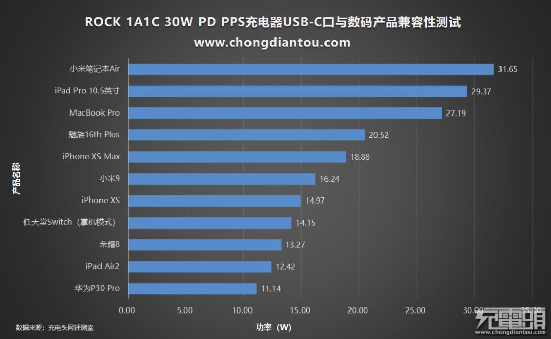 ROCK 1A1C 30W PD充电器USB-C口对于大部分的数码产品兼容性不错,都能握手对应协议进行充电。