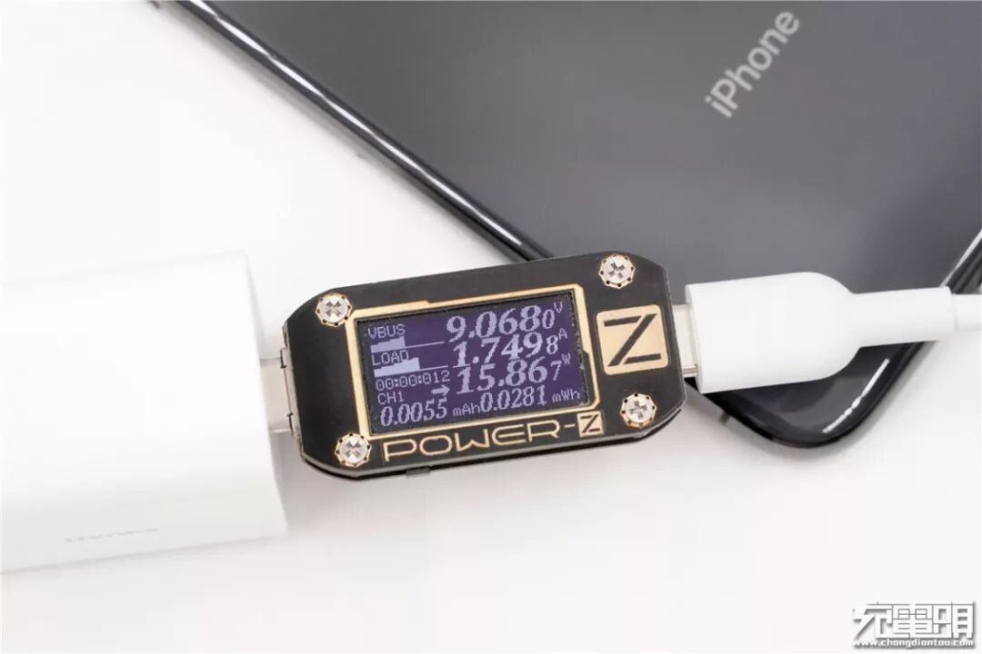 充iPhone XS,电压9.06V,电流1.74A,功率15.86W,开启PD快充。
