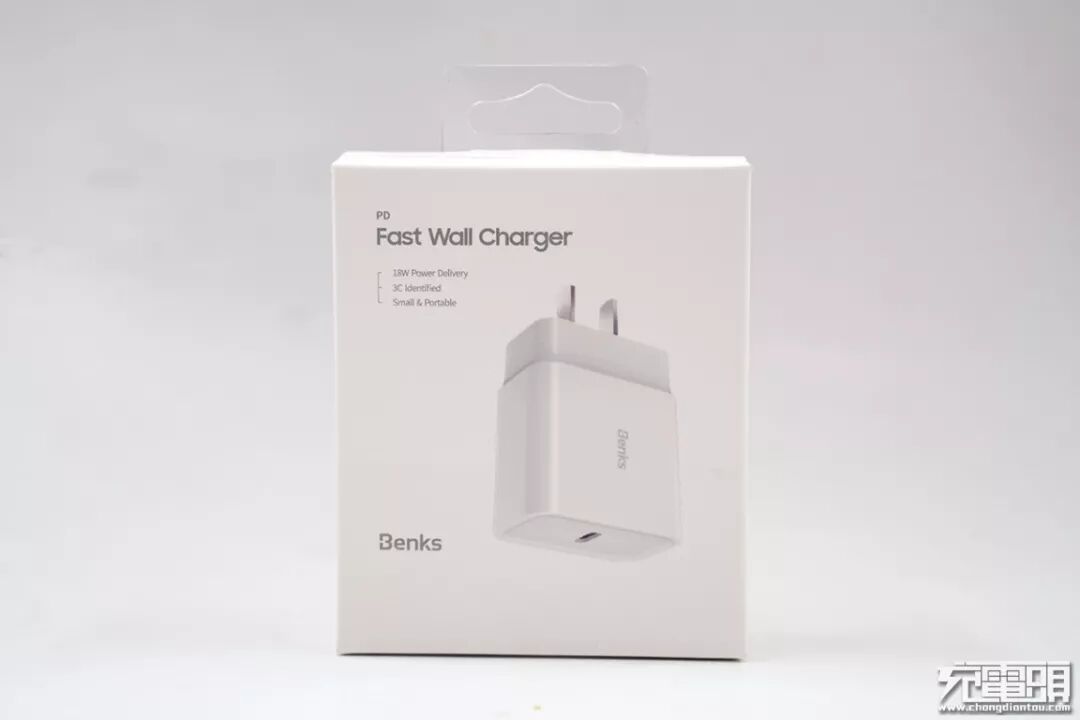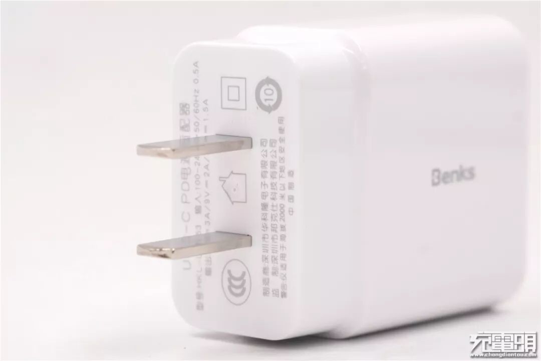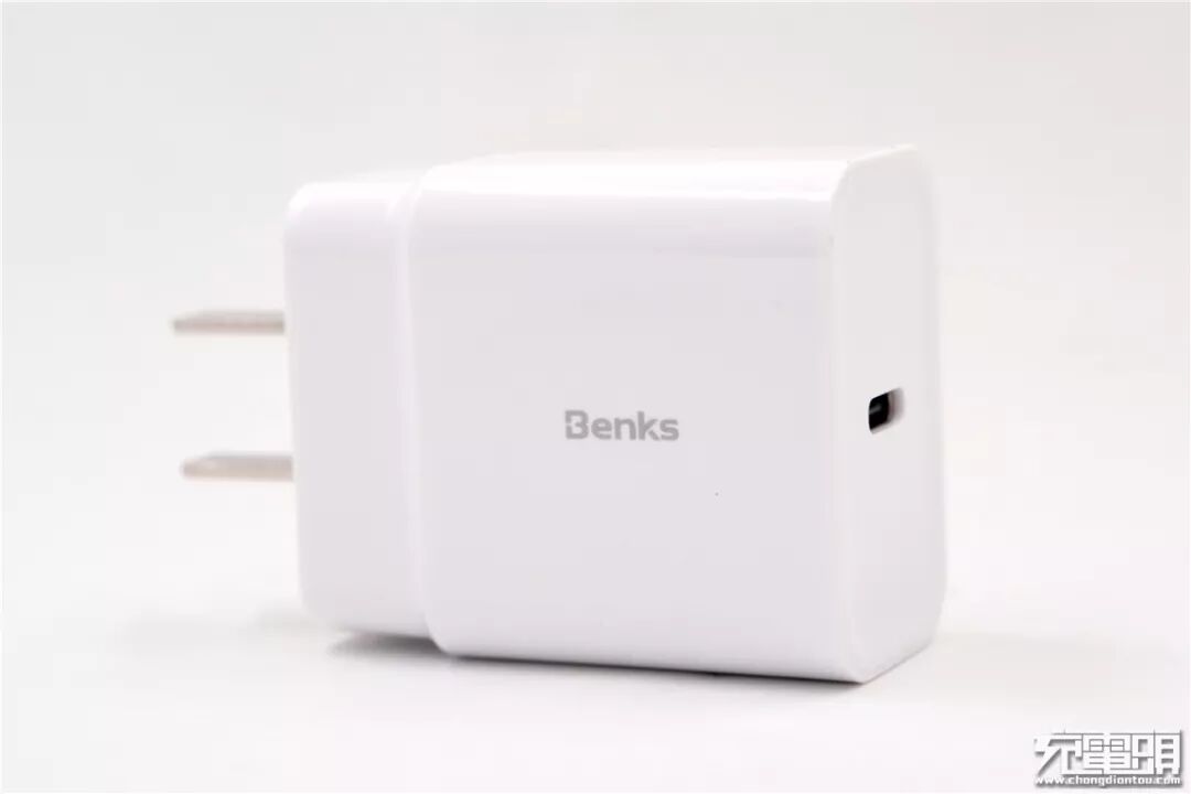 充电器外壳设计具有段落感,整体以白色为底,正面印有“Benks”logo,左侧面有插脚,右侧面有输出接口。