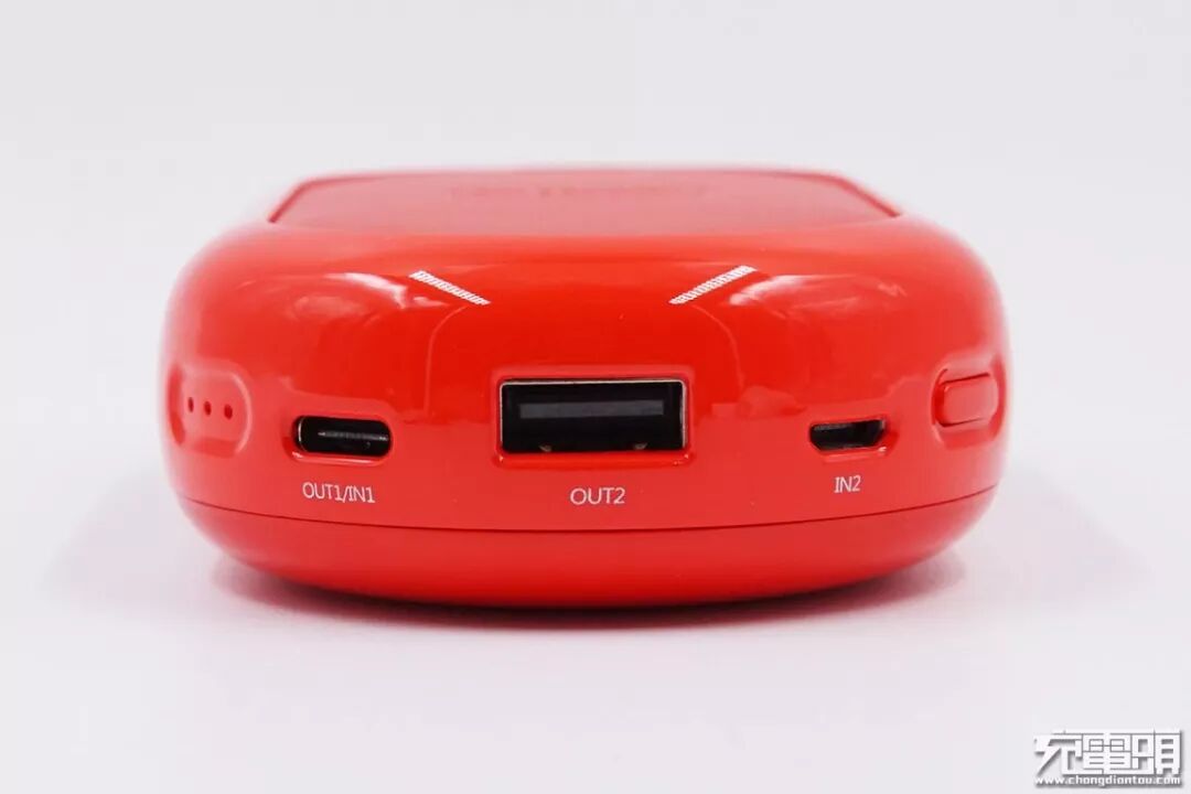 再来看看小红玩的接口部分,小红玩的指示灯、接口、电量显示按键均在于腰身顶部,上图所示从左至右分别为电量指示灯、USB-C输入输出接口(OUT1/IN1)、USB-A输出接口(OUT2)、Micro USB输入接口(IN2)、电量显示按键。