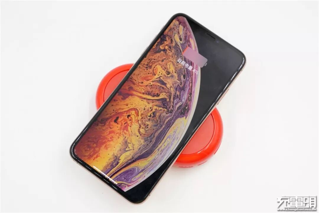 CIKE小红玩二合一无线充移动电源可给iPhone XS Max无线充电。