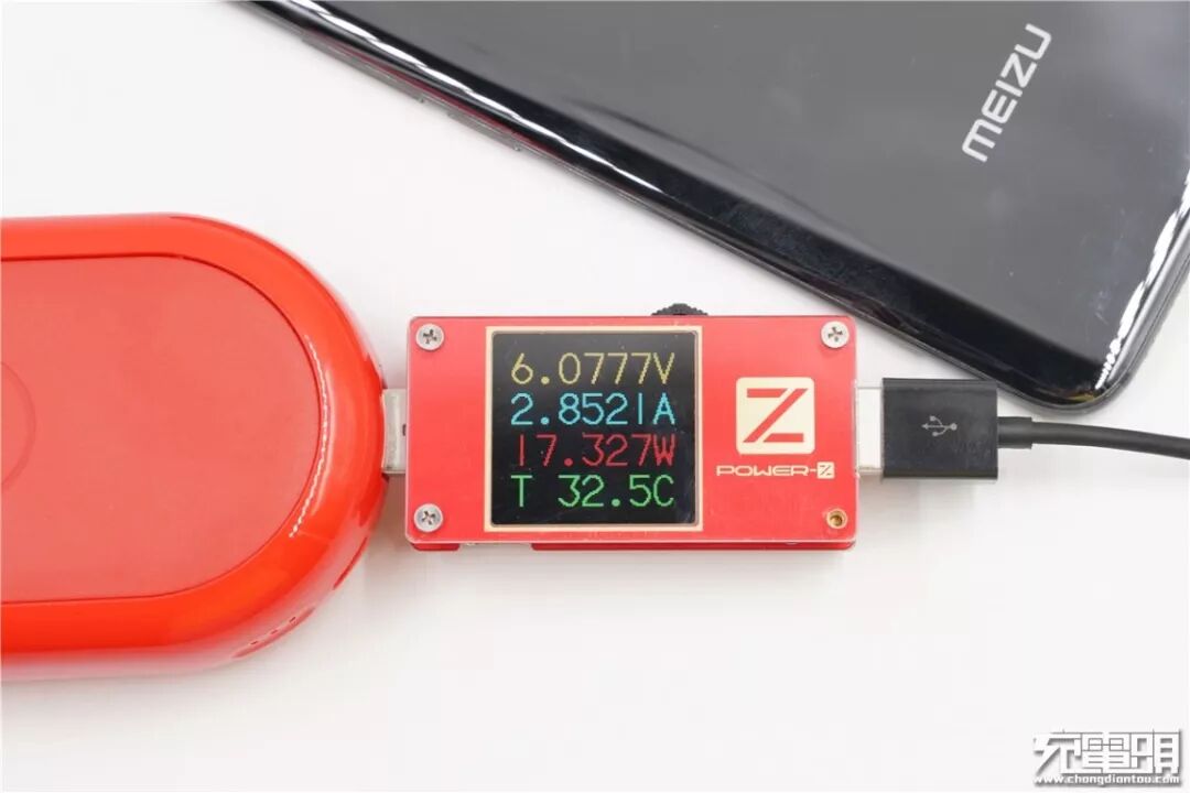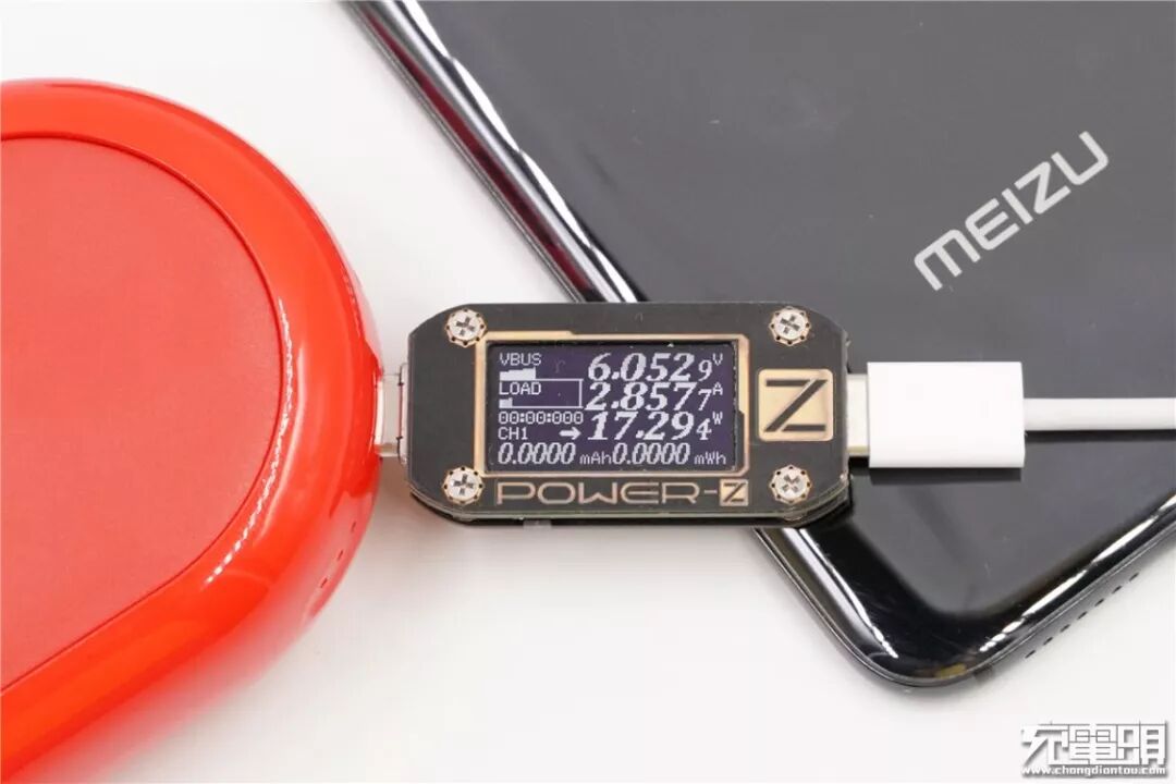充魅族16th Plus,电压6.07V,电流2.85A,功率17.32W,开启PE快充。小红玩的USB-A口支持PE快充。