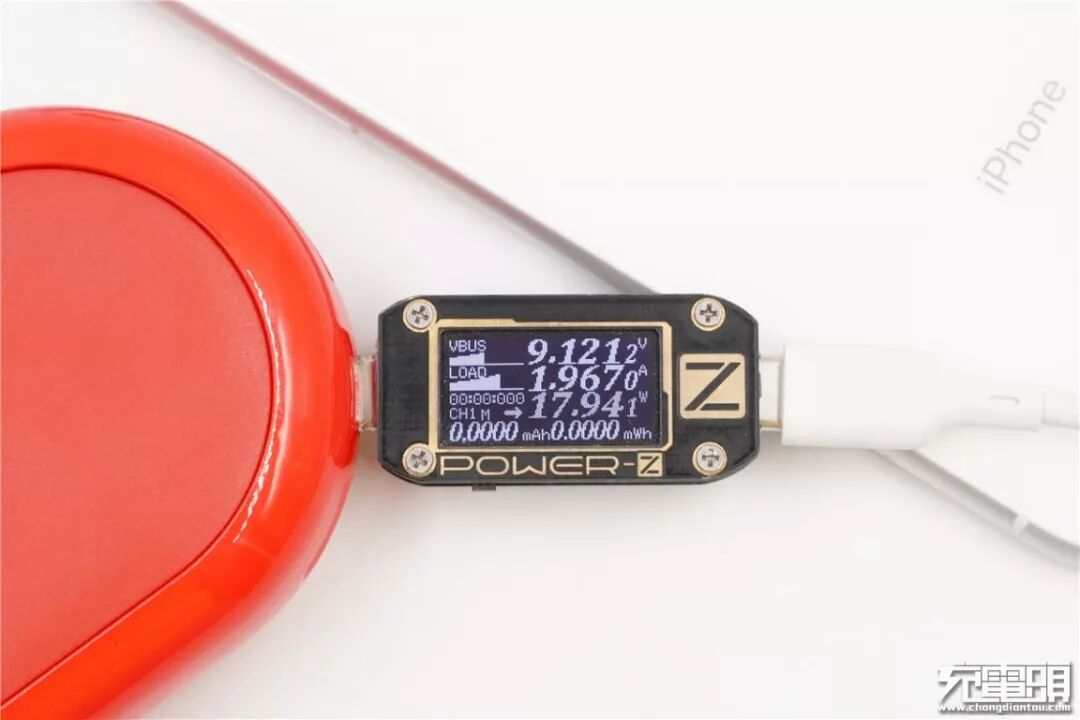 充iPhone XR,电压9.12V,电流1.96A,功率17.94W,开启PD快充。