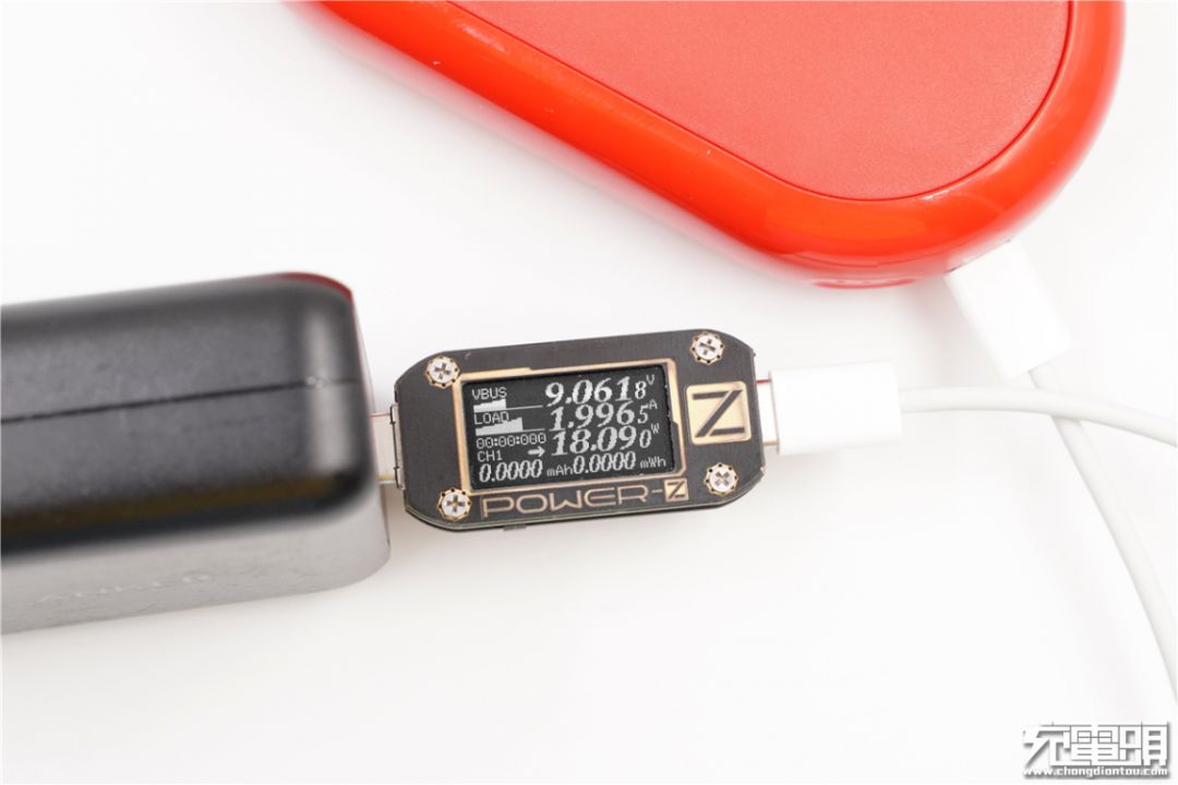 ANKER 30W PD充电器充小红玩,电压9.06V,电流1.99A,功率18.09W,USB-C接口输入开启PD快充。