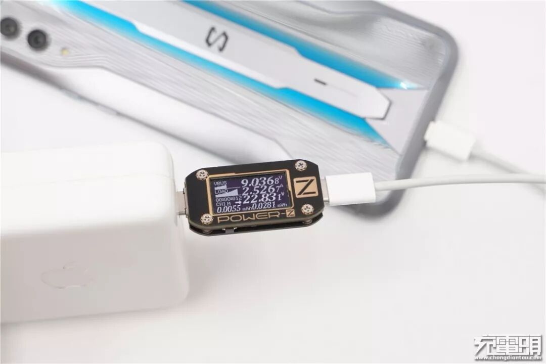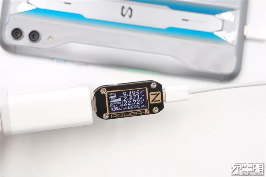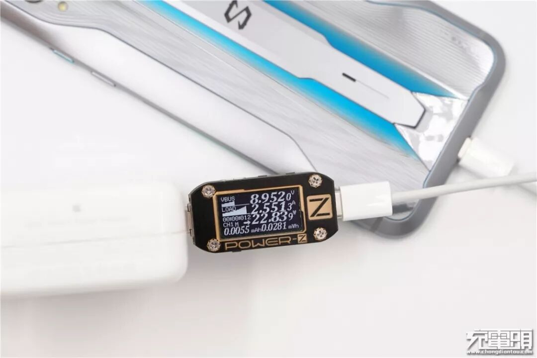 使用苹果30W PD充电器充黑鲨游戏手机2 Pro,电压8.95V,电流2.55A,功率22.83W,开启PD快充。