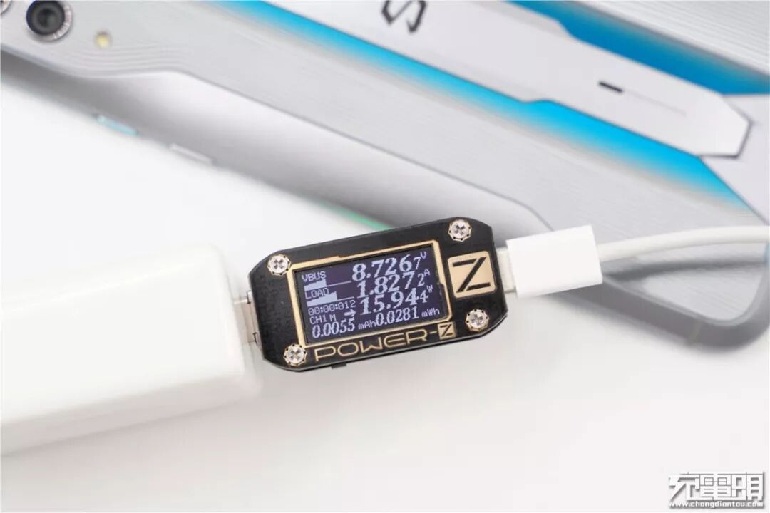 使用锤子18W PD充电器充黑鲨游戏手机2 Pro,电压8.72V,电流1.82A,功率15.94W,开启PD快充。