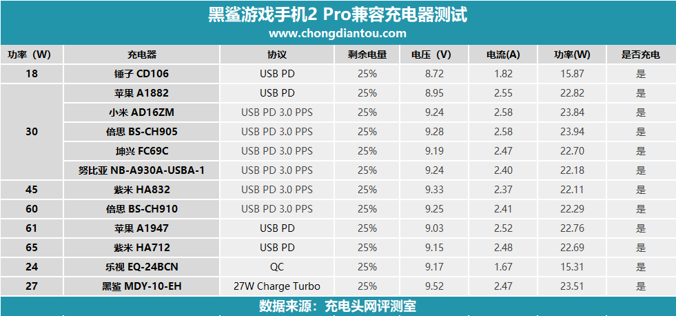 黑鲨游戏手机2 Pro支持PD、QC和27W Charge Turbo三种快充,并且大功率充电模式(27W)走的是最常见的公开通用PD协议,只要充电器拥有9V/3A,功率可以达到24W+。