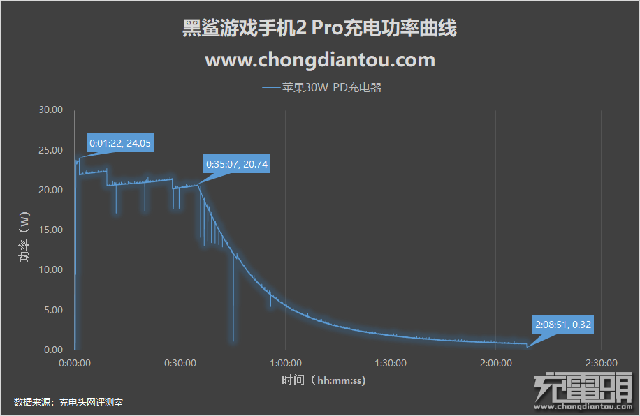 使用苹果30W PD充电器为黑鲨游戏手机2 Pro全程充电,功率变化曲线同样大致分为两部分。前35分钟前持续大功率输出,功率平台在22W左右;35分钟后功率开始逐渐下降。全程最高功率24.05W,全程耗时2小时8分钟。