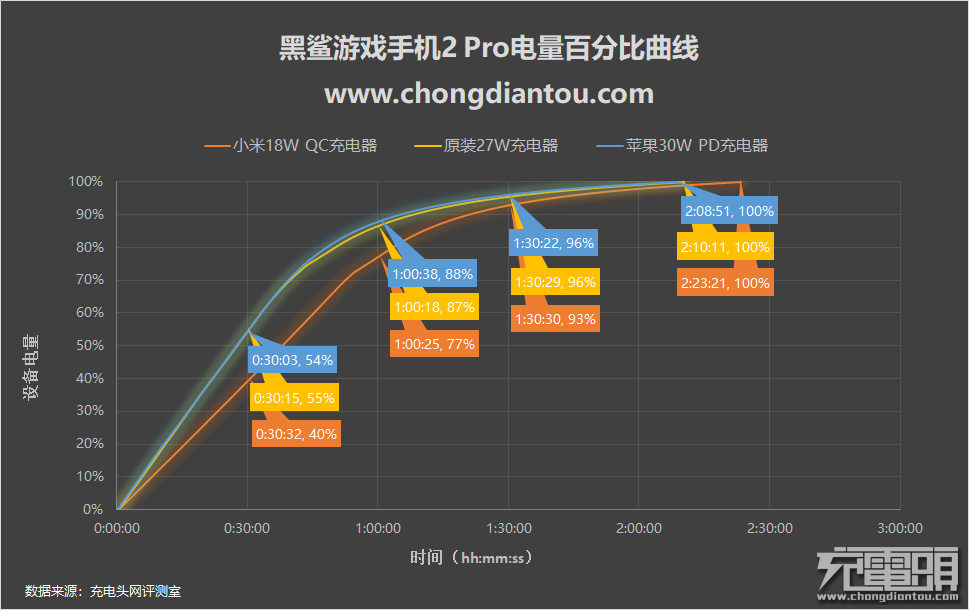 使用原装27W 充电器为黑鲨游戏手机2 Pro全程充电,半小时充入电量55%,1小时充入量87%,1小时30分充入96%,全程耗时2小时10分。