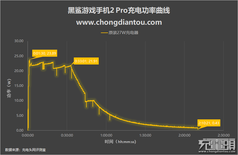 使用原装27W充电器为黑鲨游戏手机2 Pro全程充电,功率变化曲线大致分为两部分。前33分钟前持续大功率输出,功率平台在22W左右;33分钟后功率开始逐渐下降。全程最高功率23.89W,全程耗时2小时10分钟。