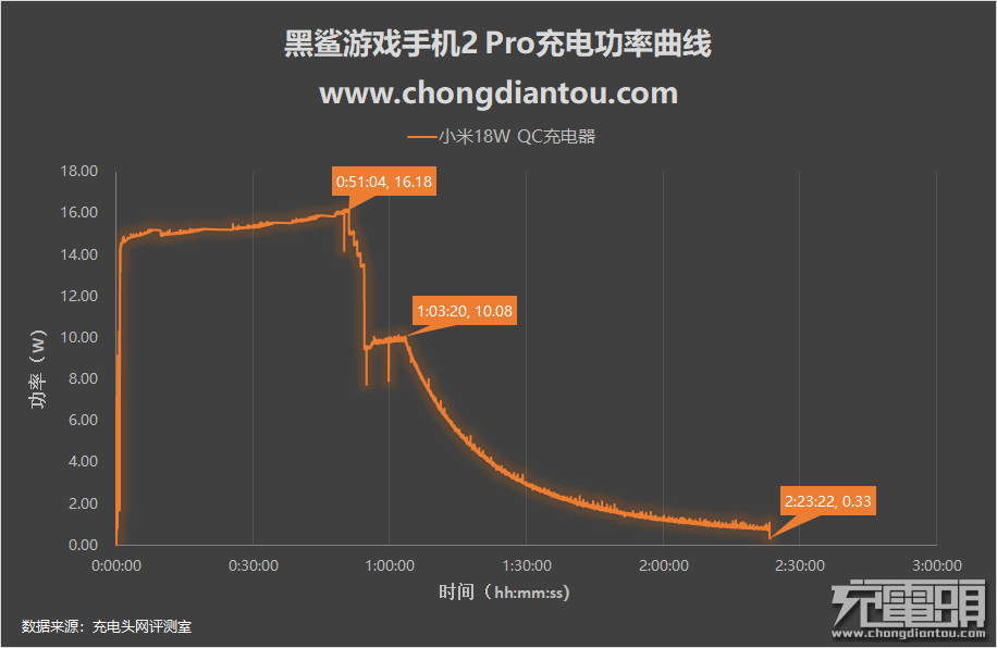 使用小米18W QC充电器为其全程充电,功率平台有2段:15W、10W。充电前51分钟功率维持在较高的一个状态,全程功率最高16.18W;随后功率开始下降。全程耗时2小时23分钟。
