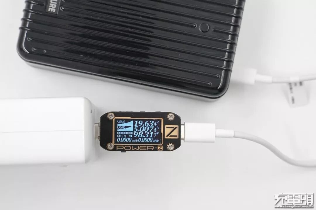使用ANKER 100W PD充电器给ZENDURE SuperTank 100W PD移动电源充电,数据线采用的是华为USB-C to USB-C 5A数据线,当前电压19.63V,电流5A,功率98.31W,开启PD快充,这款华为数据线承载5A电流没啥问题。